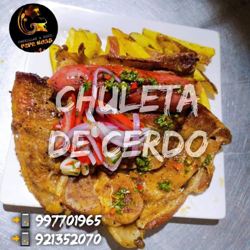 En Parrillas y Restobar Pepe Ross te presentamos nuestra irresistible Chuleta de Cerdo a la parrilla, una joya de la gastronomía criolla preparada con carne de cerdo jugosa, marinada con especias peruanas y cocinada al punto perfecto para lograr un sabor inigualable.